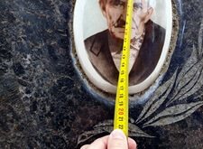 Первым делом мы замерили круглые портреты покойных на керамике. Старые пора было заменить, а новые предполагалось установить на то же самое надгробье, поэтому овалы должны быть идентичны предыдущим.